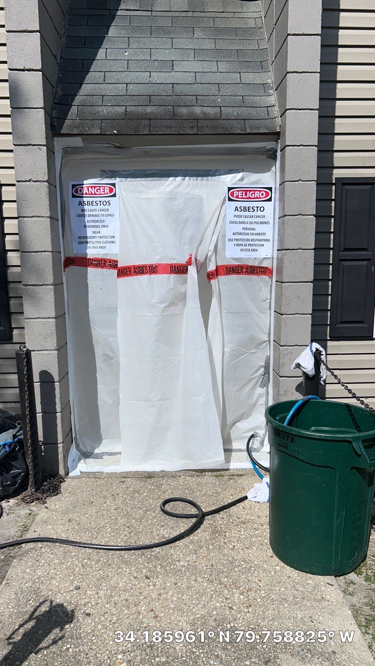 At EAS Environmental, your safety—and that of our crew—always comes first. Since an extremely large amount of ACMs were identified on this project, EASE followed the regulated containment procedures outlined in SC Regulation 61.86.1 for NESHAP Projects. NESHAP stands for National Emission Standards for Hazardous Air Pollutants, and this level of regulation applies for projects that have greater than 260 square feet of ACMs. This requires a decontamination enclosure system adjoining the contained work area. This consists of a clean room equipped with appropriate storage containers and adequate space for changing clothing; an air lock; a shower room containing hot and cold or warm running water controllable at the tap; and an equipment room suitable for storage of tools and equipment. After the containment is set up, equipment can be loaded in.